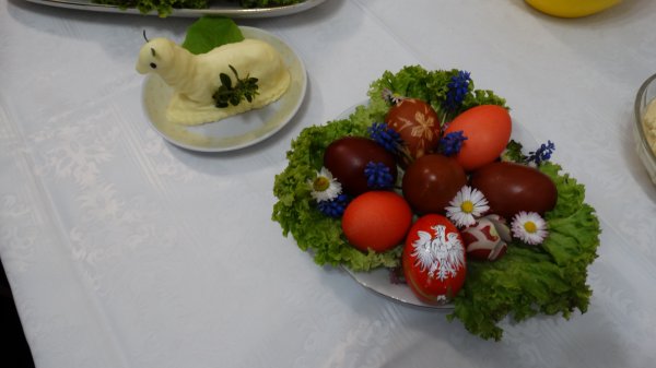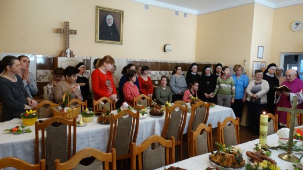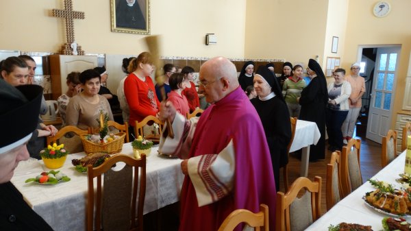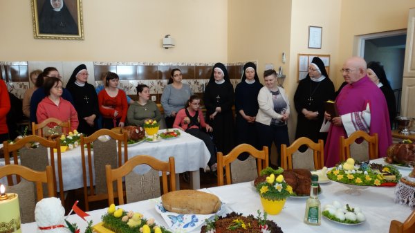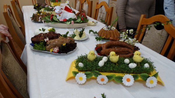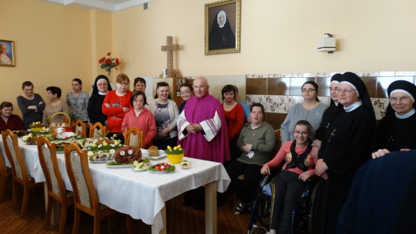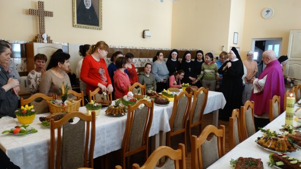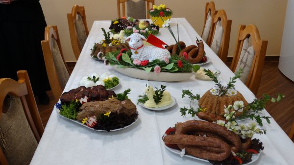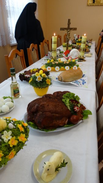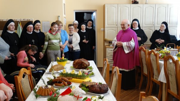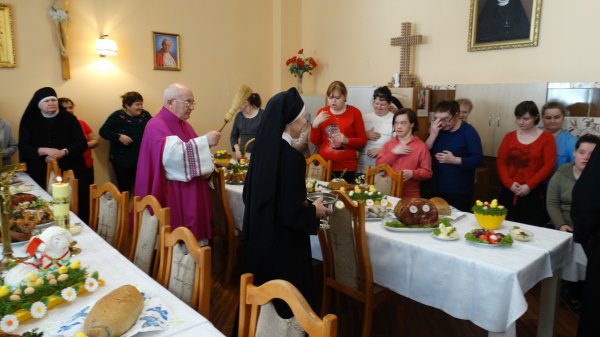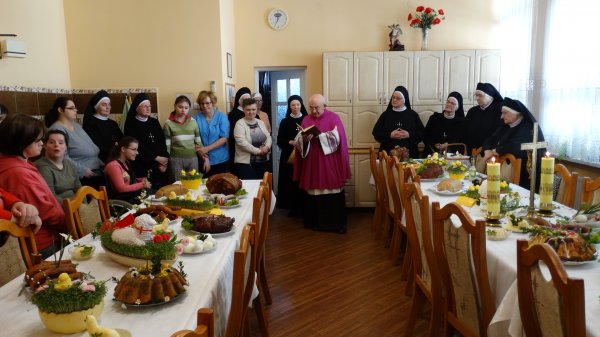 Przy pięknie przygotowanych stołach, bogatych w różne potrawy, gromadzą się Mieszkanki, Siostry i Personel naszego Domu, aby uczestniczyć w poświęceniu potraw. Potrawy poświęcał nasz Ks. Kanonik Władysław, Kapelan naszego Domu.
