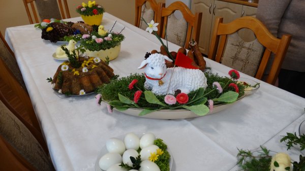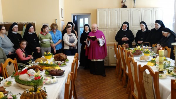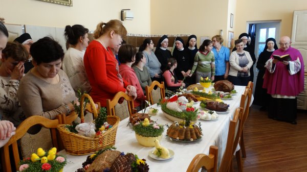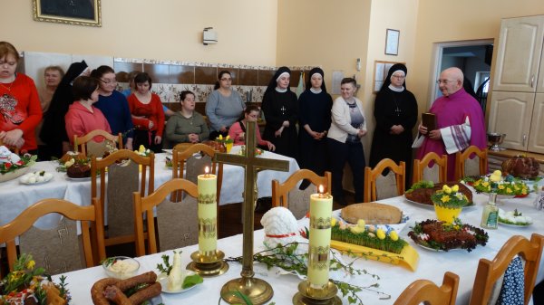 Przy pięknie przygotowanych stołach, bogatych w różne potrawy, gromadzą się Mieszkanki, Siostry i Personel naszego Domu, aby uczestniczyć w poświęceniu potraw. Potrawy poświęcał nasz Ks. Kanonik Władysław, Kapelan naszego Domu.